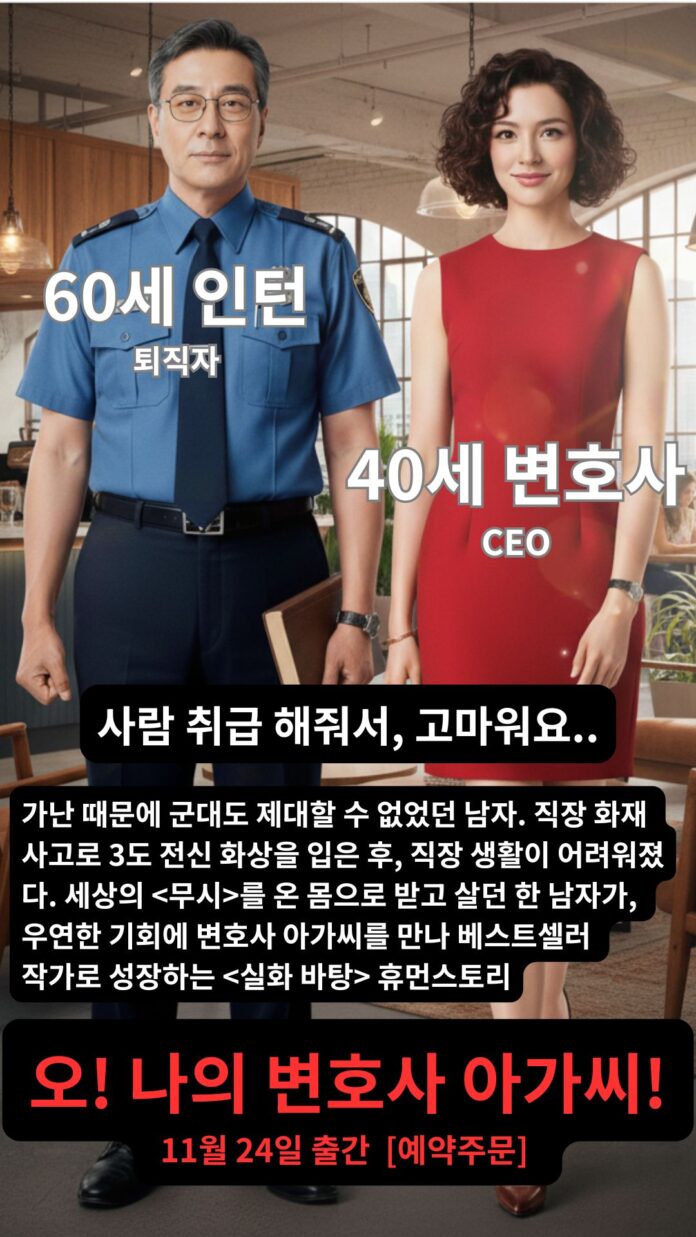 필자가 이번에 참여한 소설책의 제목은 <오! 나의 변호사 아가씨>이다. 이 소설은 찢어지게 가난하여 군대마저 의가사 제대할 수밖에 없었던 한 남자의 인생 이야기를 담고 있다. 30대에 직장 내 화재 사고로 3도 전신화상을 입고 젊은 나이에 경비원이 될 수밖에 없었던 남자의 이야기. 30년의 세월 동안 경비의 삶을 살아오면서 겪은 세상의 모욕과 멸시 극복하기 위해, 글을 써오던 60세 경비 아저씨가 우연한 기회에 변호사 아가씨를 만나 꿈을 이루는 실제 스토리를 바탕으로 각색한 한 소설이다. 부끄러운 말이지만, 이 책에 나오는 변호사 아가씨는 필자다.